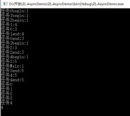 namespace ZL.AsyncDemo { class Program { static string val; static void Main(string[] args) { Run(); Console.ReadLine(); } async static void Run() { var tasks = new List<Task<string>>(); for(var i = 0; i < 5; i++) { var task = DoTask(i); tasks.Add(task); }