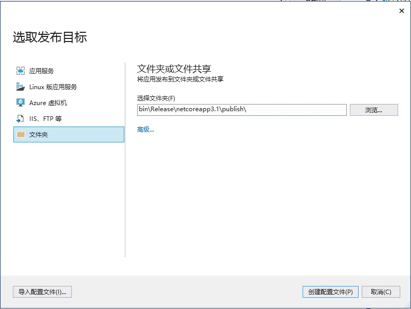 现在我们部署已经创建好的简单应用。在Visual Studio 2019菜单中选择生成->发布,然后选择文件作为发布目标: